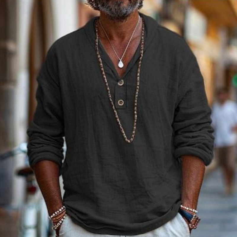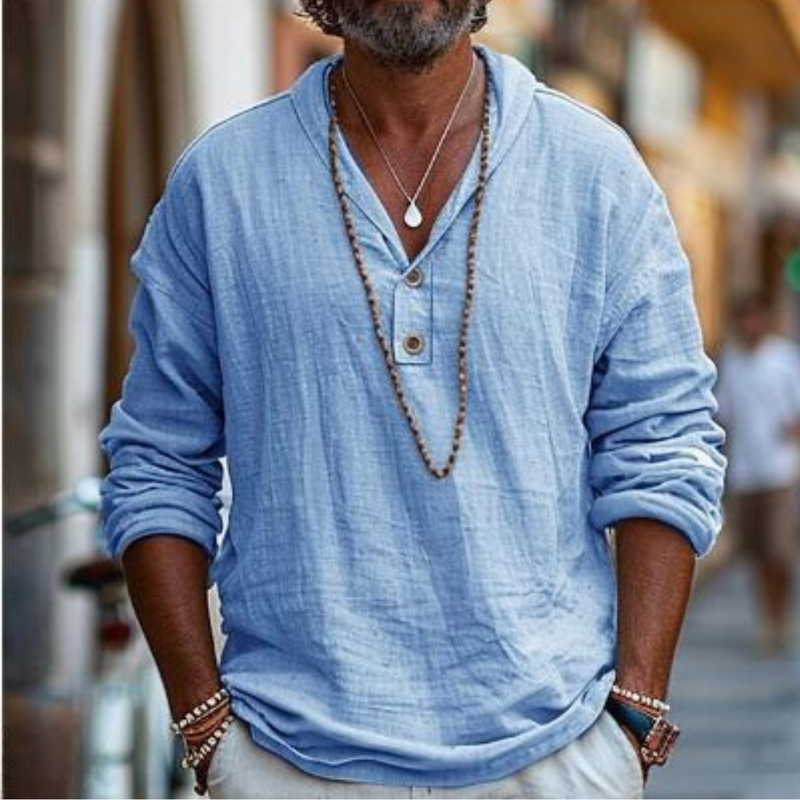 Herren Langarm Shirt mit V-Ausschnitt | Lockeres Freizeithemd mit Knöpfen